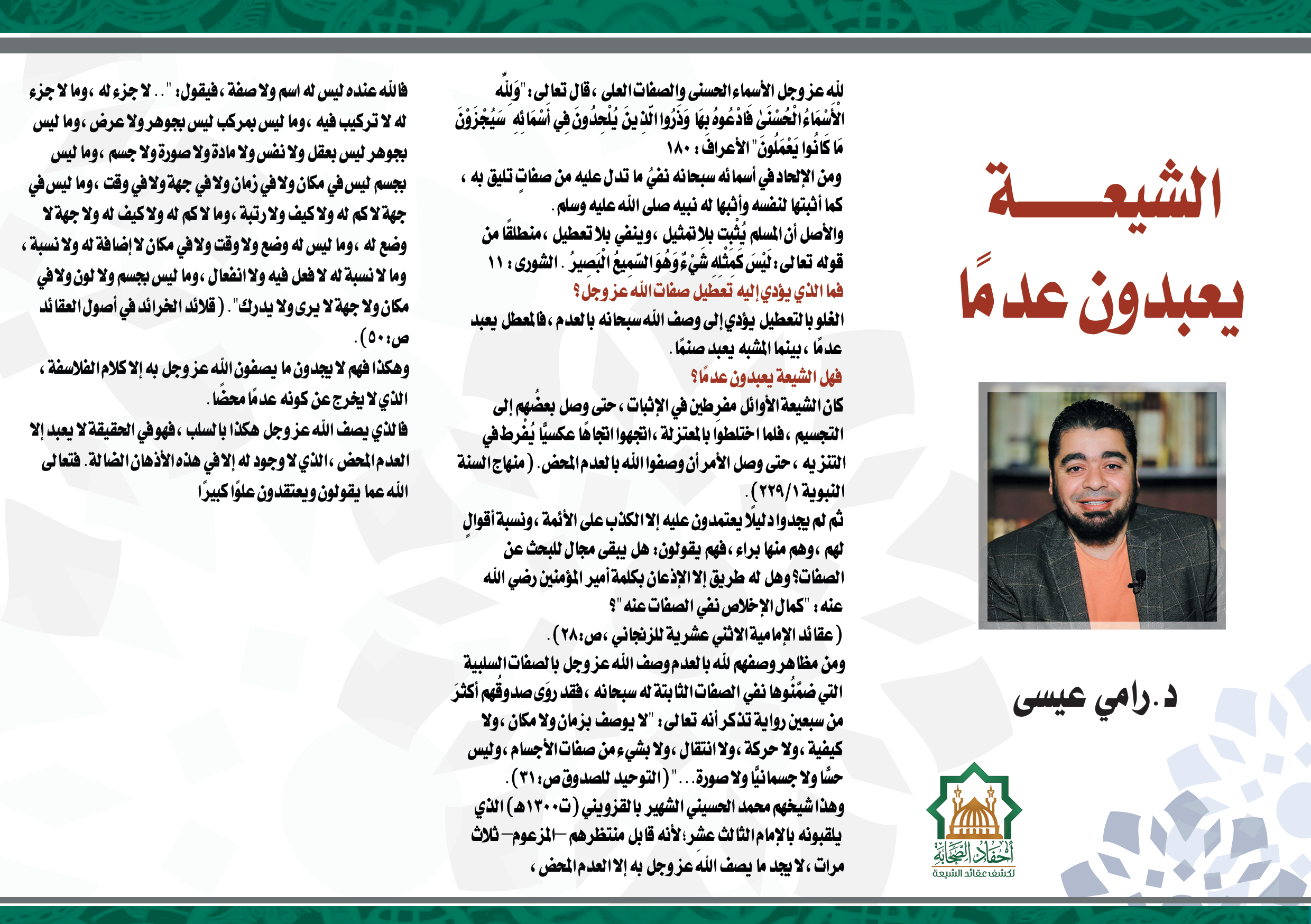 وهذا شيخهم محمد الحسيني الشهير بالقزويني (ت 1300هـ) الذي يلقبونه بالإمام الثالث عشر؛ لأنه قابل منتظرهم –المزعوم– ثلاث مرات، لا يجد ما يصف الله عز وجل به إلا العدم المحض، فالله عنده ليس له اسم ولا صفة، فيقول: ".. لا جزء له، وما لا جزء له لا تركيب فيه، وما ليس بمركب ليس بجوهر ولا عرض، وما ليس بجوهر ليس بعقل ولا نفس ولا مادة ولا صورة ولا جسم، وما ليس بجسم ليس في مكان ولا في زمان ولا في جهة ولا في وقت، وما ليس في جهة لا كم له ولا كيف ولا رتبة، وما لا كم له ولا كيف له ولا جهة لا وضع له، وما ليس له وضع ولا وقت ولا في مكان لا إضافة له ولا نسبة، وما لا نسبة له لا فعل فيه ولا انفعال، وما ليس بجسم ولا لون ولا في مكان ولا جهة لا يرى ولا يدرك". (قلائد الخرائد في أصول العقائد ص50).